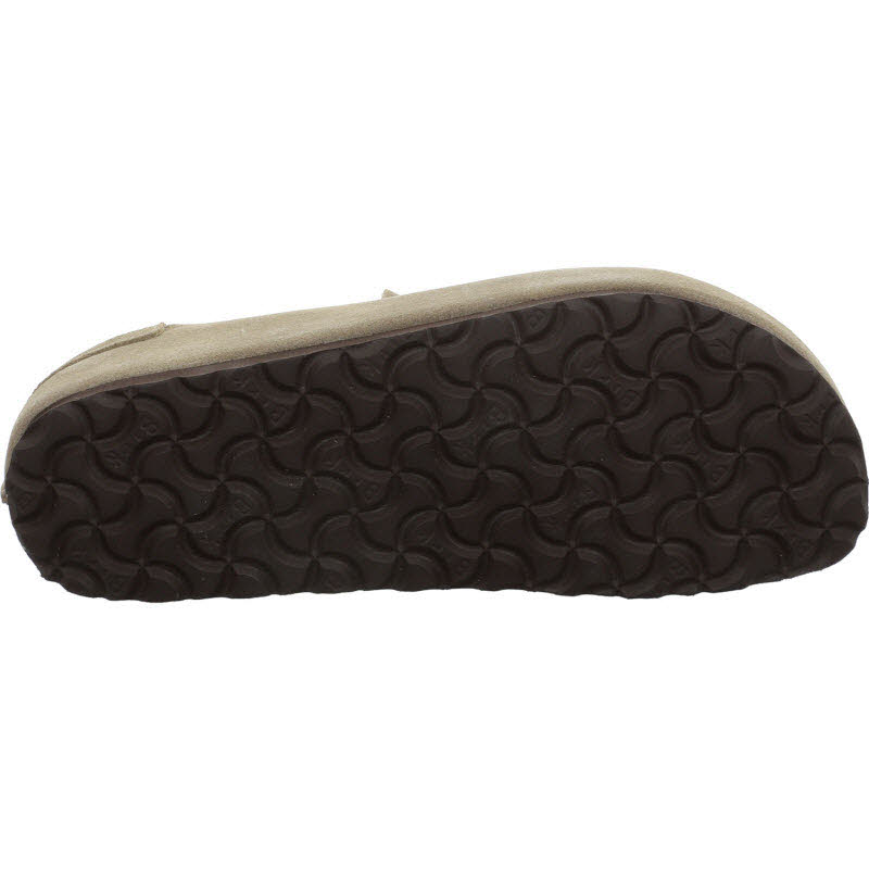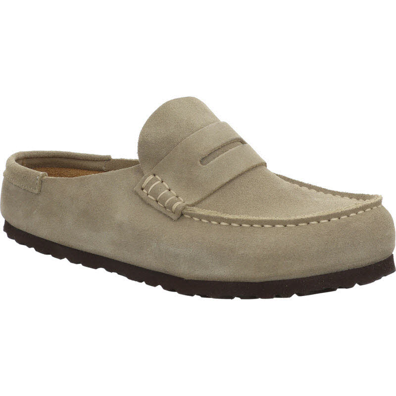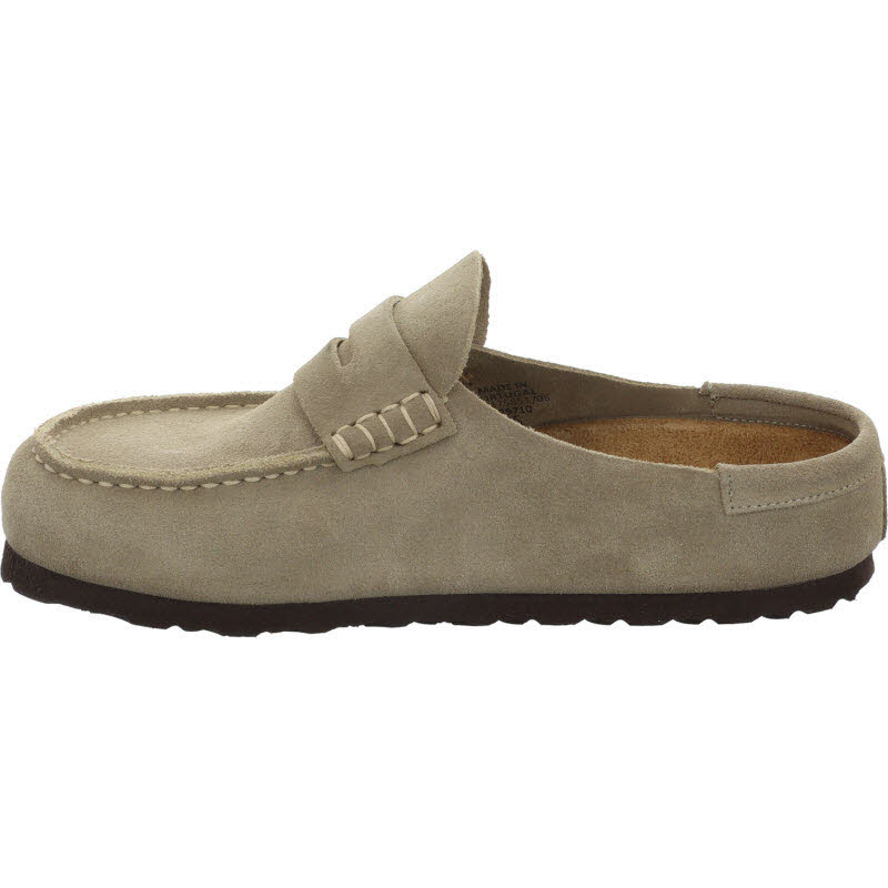 Sabot von Birkenstock in beigem Veloursleder. In der schmäleren Weite (narrow/schmal) ausgeführt.