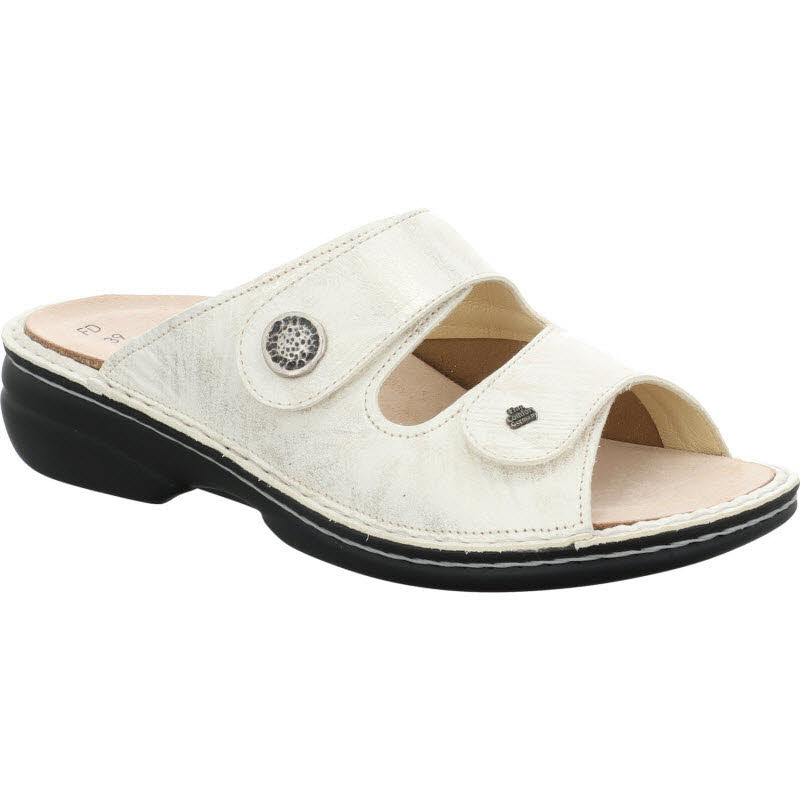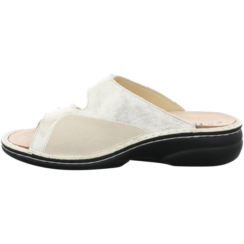 Fußbettpantolette von "Finn Comfort" mit herausnehmbarem Wechselfußbett und seitlichem Strechtcheinsatz für Hallux Valgus.