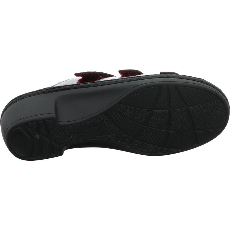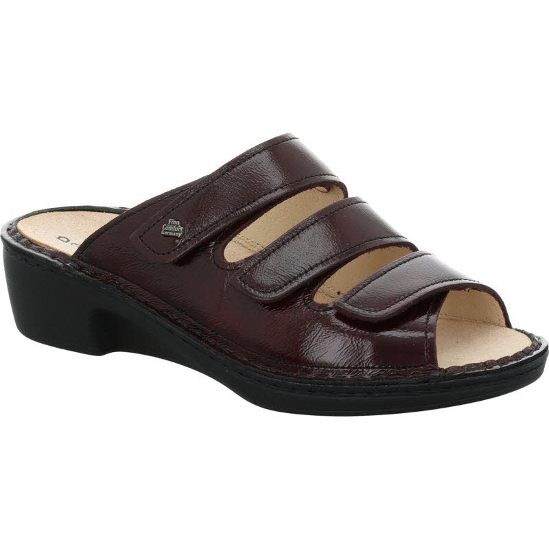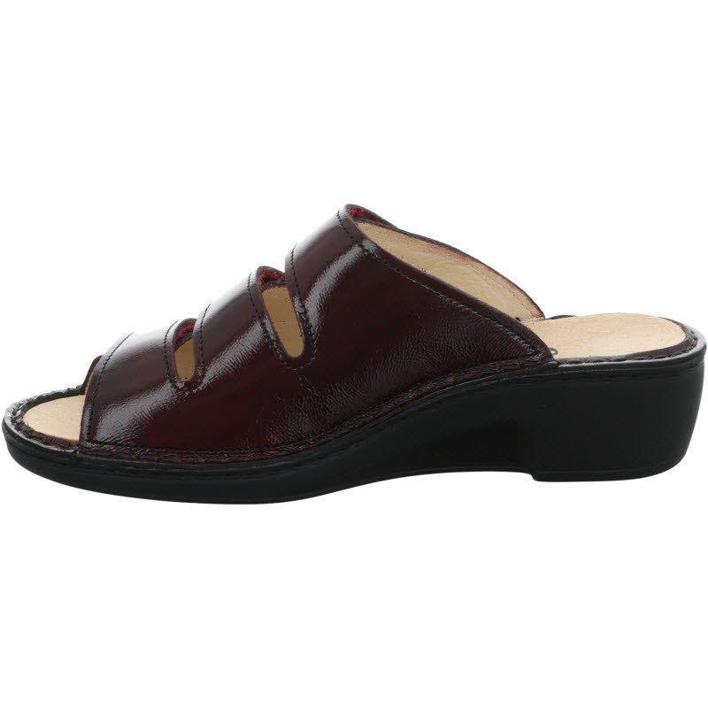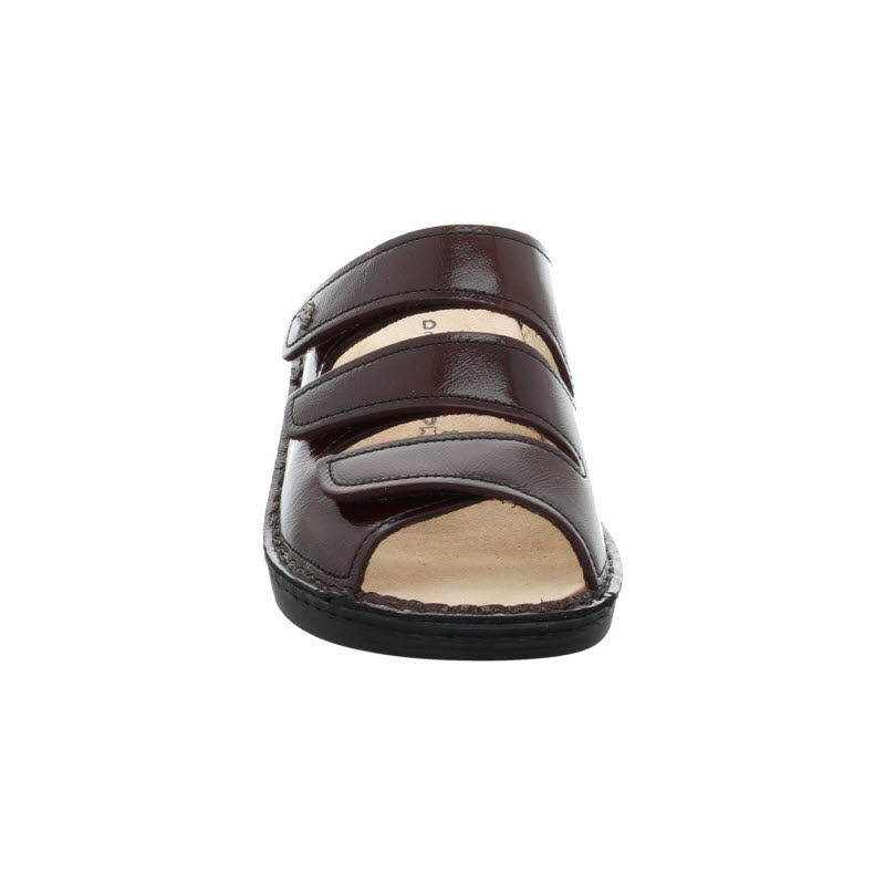 Fußbettpantoffel von Finn Comfort in bordeauxrotem Lackleder. Das Wechselfußbett kann einfach herausgenommen und getauscht werden.