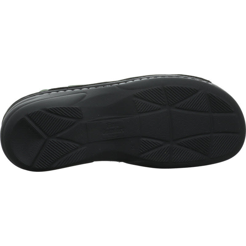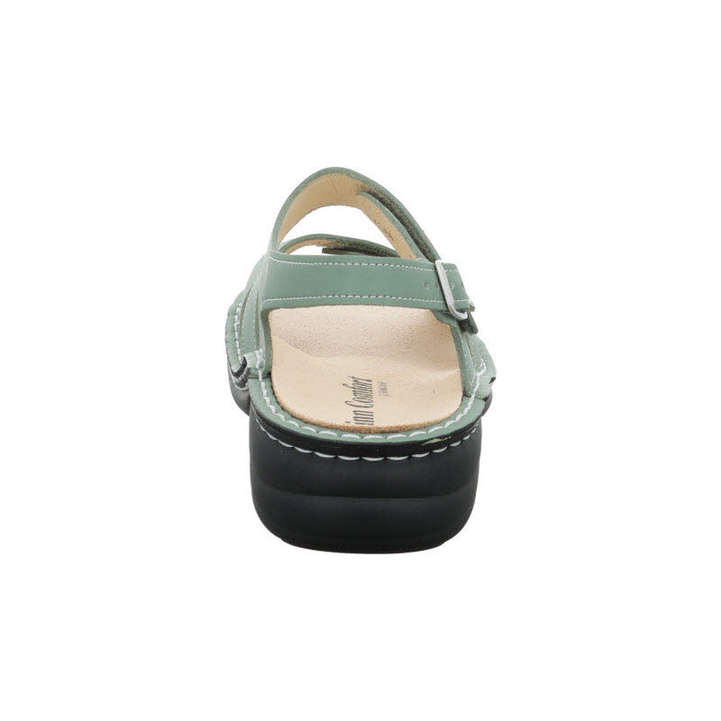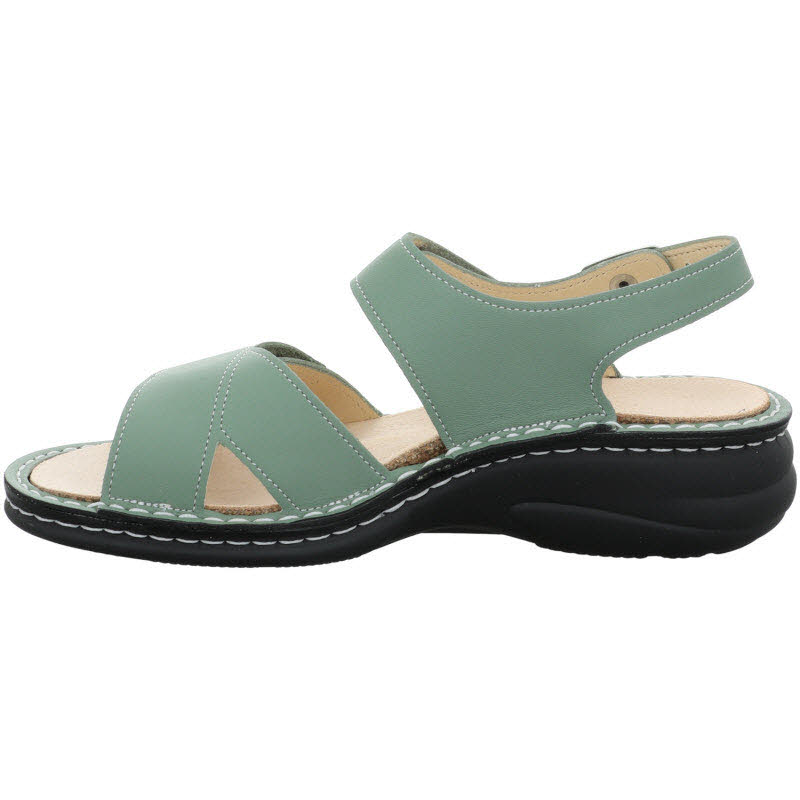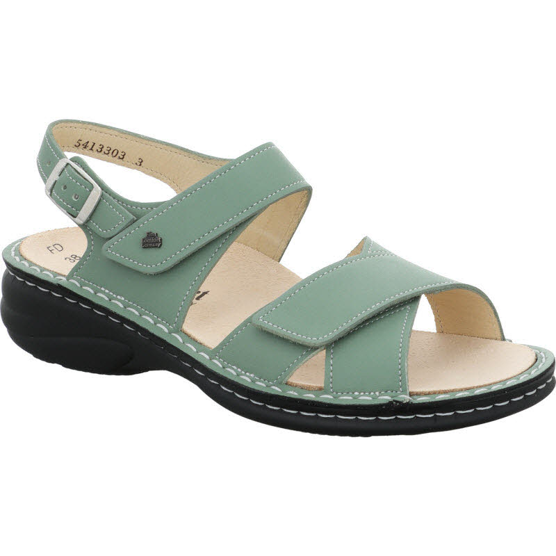 Fußbettsandale von "Finn Comfort" in grünem Nubukleder und mit herausnehmbarem Wechselfußbett.