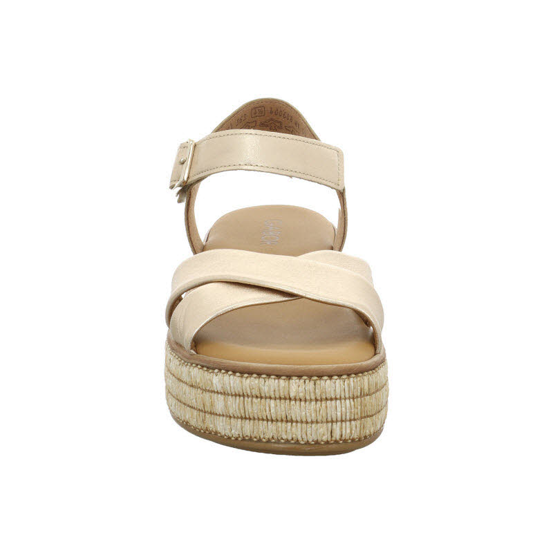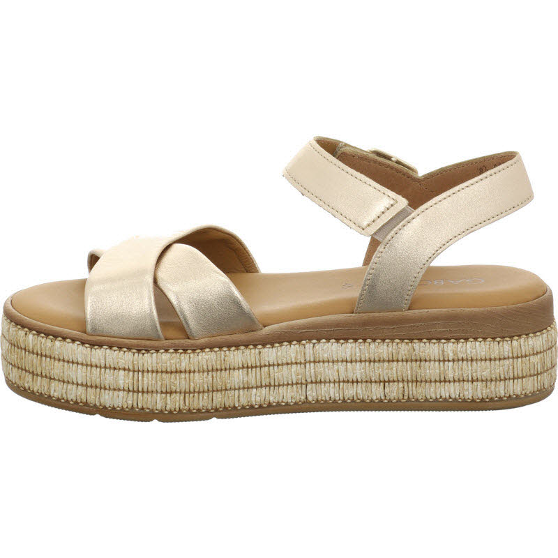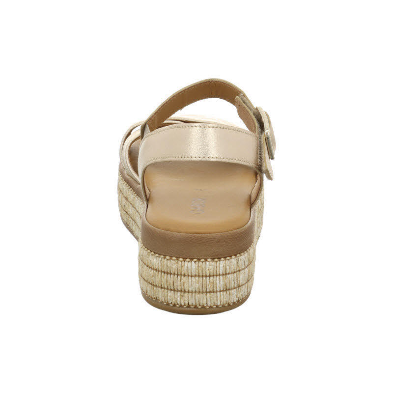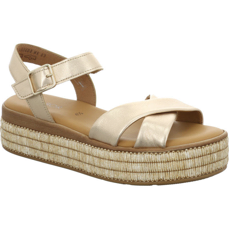 Sandale von Gabor mit goldfarbenen Riemen und Plateausohle.
