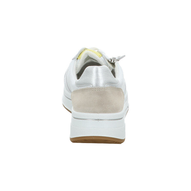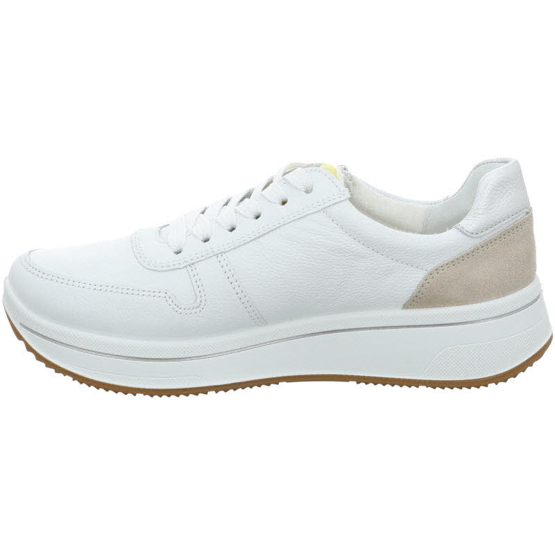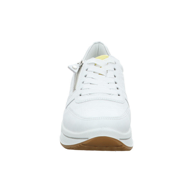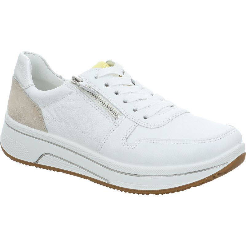 Bequemsneaker von Ara in weissem Leder und mit seitlichem Reißverschluss für komfortables Anziehen. In der Mehrweite "H" ausgeführt und deshalb für breitere Füße geeignet.