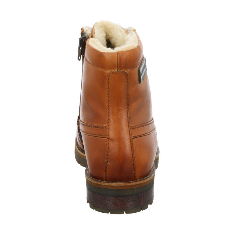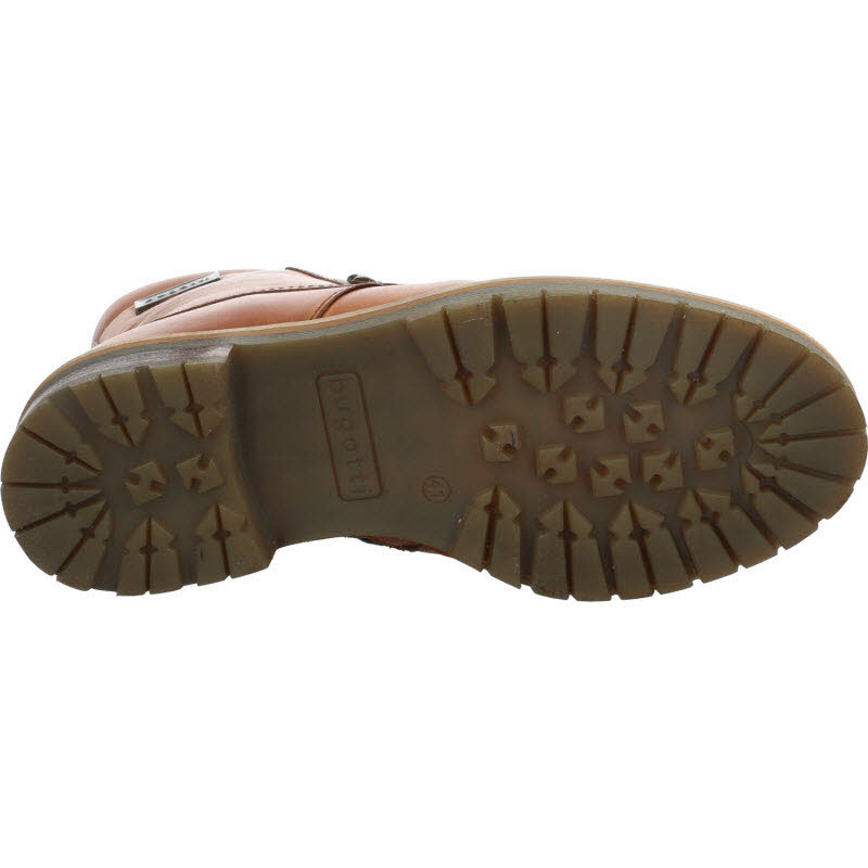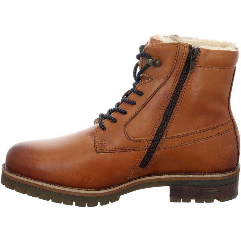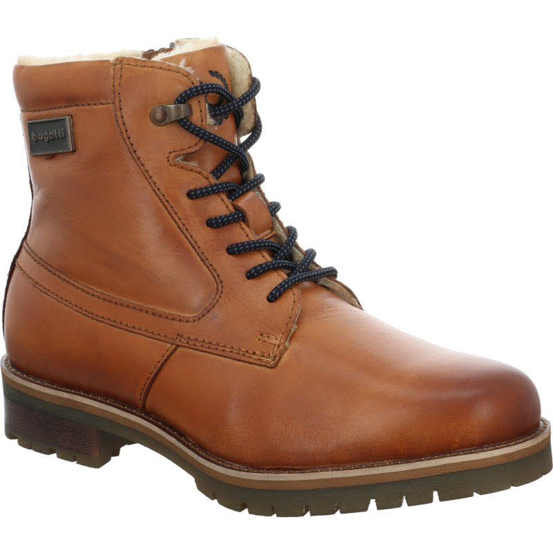 Warmgefütterte Schnürstiefelette von "Bugatti" in cognac-braunem Glattleder. An der Innenseite ist ein Reißverschluss angebracht.