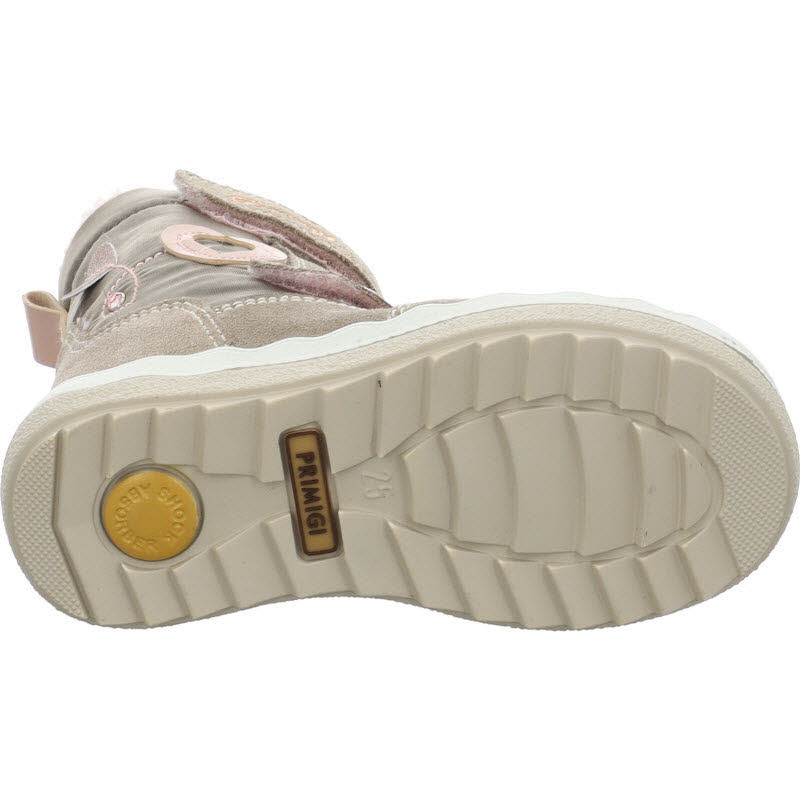 Warmgefütterter Winterstiefel von Primigi in beigem Velours-/Textil. Dank Gore-Tex Membrane ist der Stiefel mit zwei Klettverschlüssen wasserdicht.