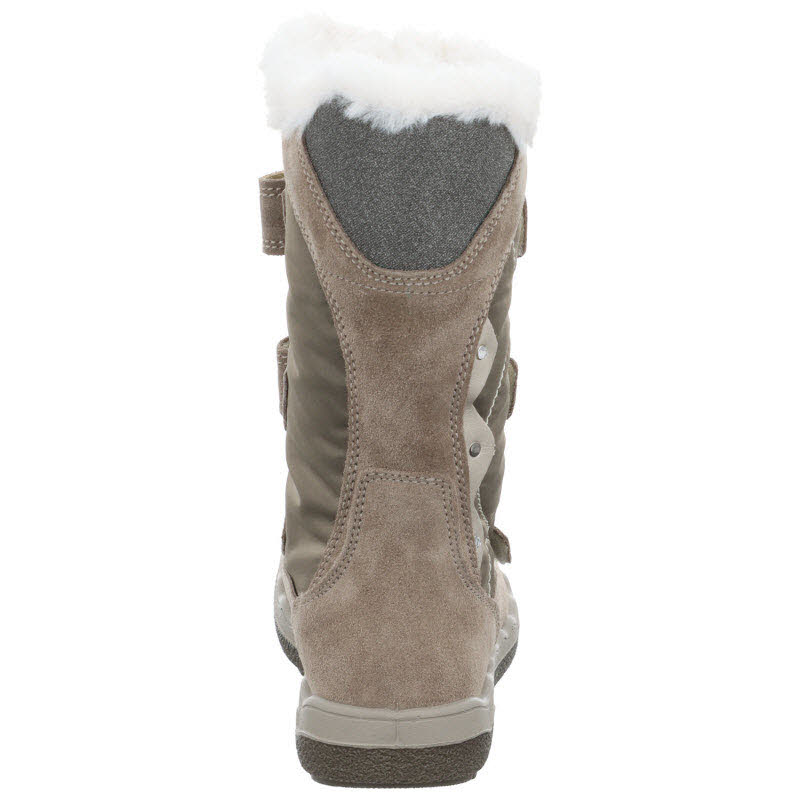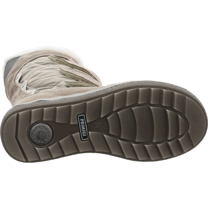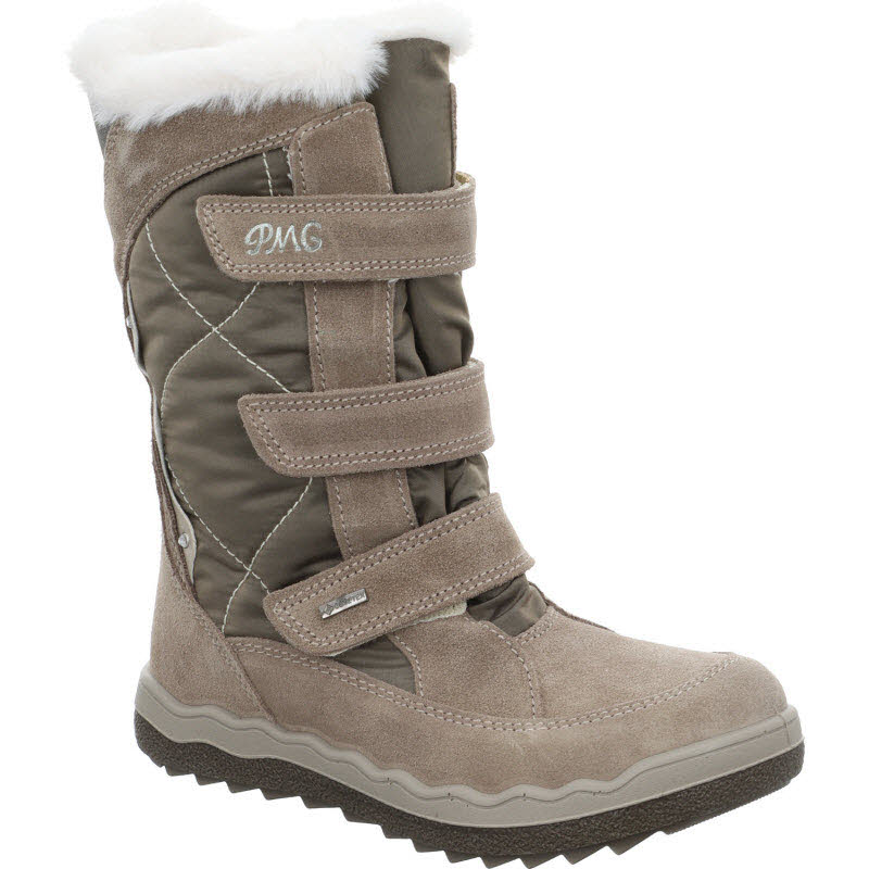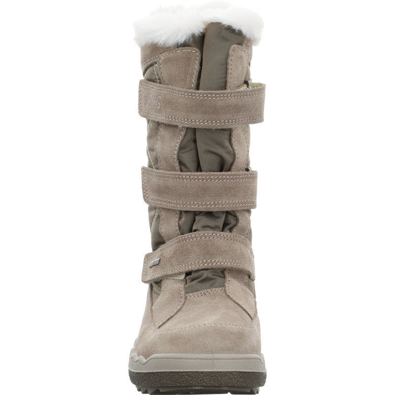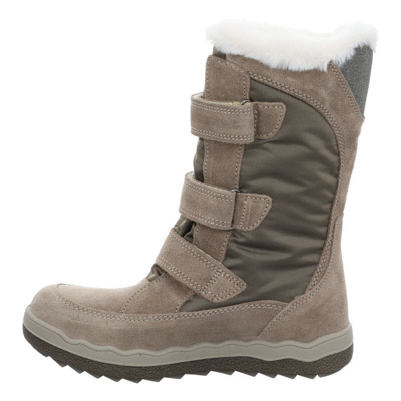 Warmgefütterter Winterstiefel von Primigi mit drei Klettverschlüssen. Das Obermaterial des Winterboots ist kombiniert aus Textil und beigem Veloursleder. Durch die Gore-Tex Membrane bleiben die Füße trocken.