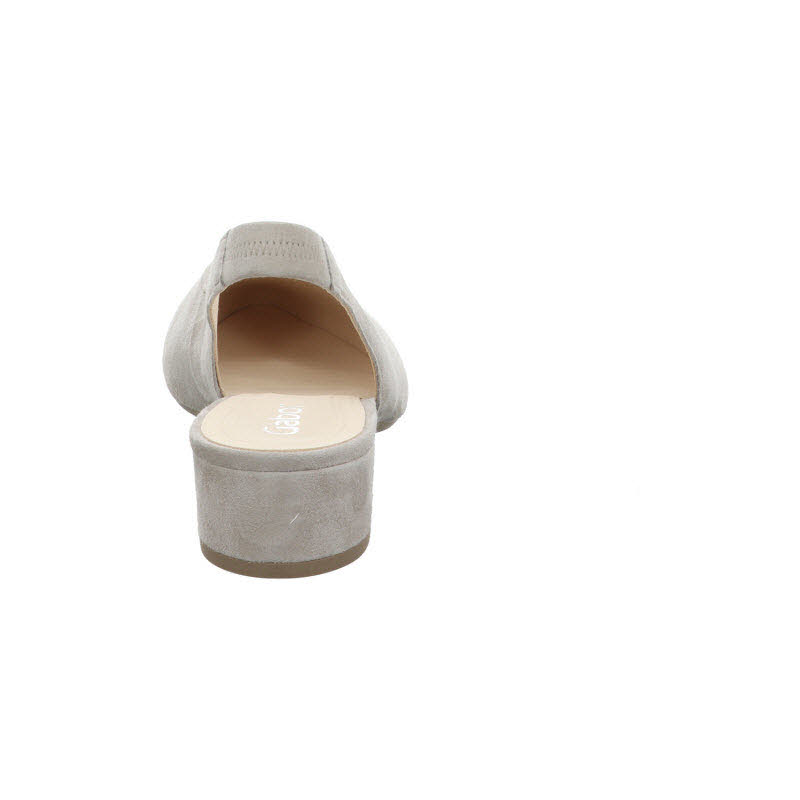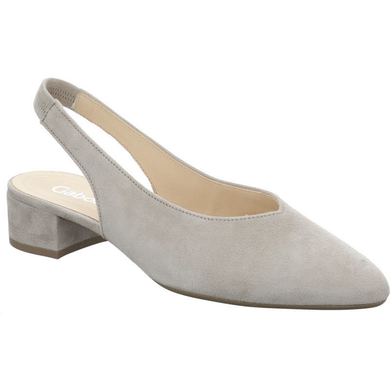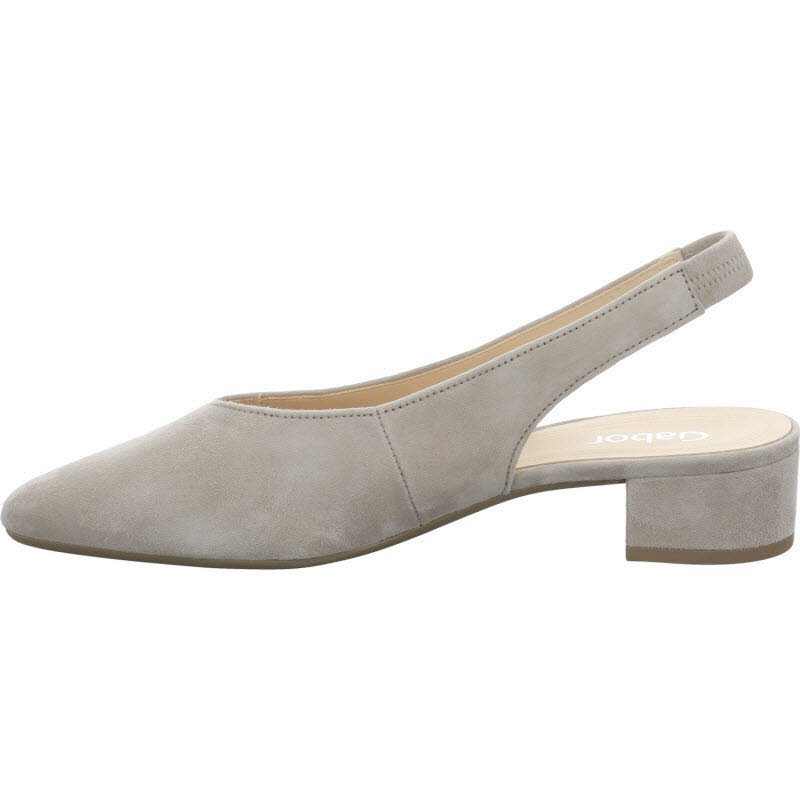 Schlichte, elegante Slingsandale mit Blockabsatz, von Gabor in beige/grauem Veloursleder.