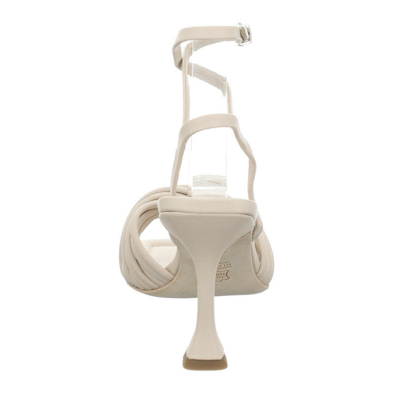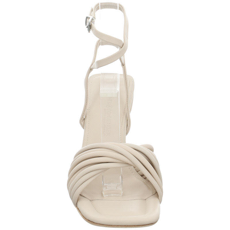 Sandalette von Kenne und Schmenger in hellbeigem Glattleder. Die zarten Fesselriemen und gekreuzten Riemen im Ballenbereich runden den Look dieser eleganten Absatzsandale ab.