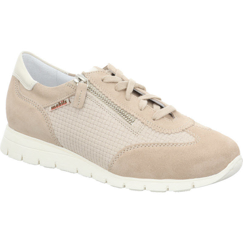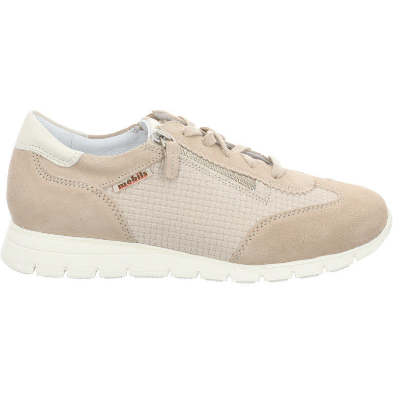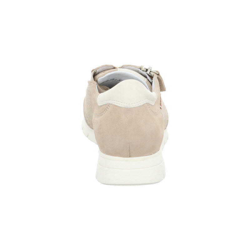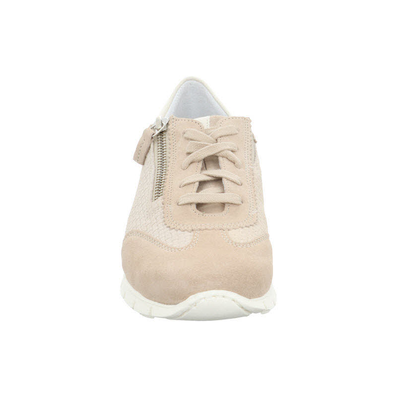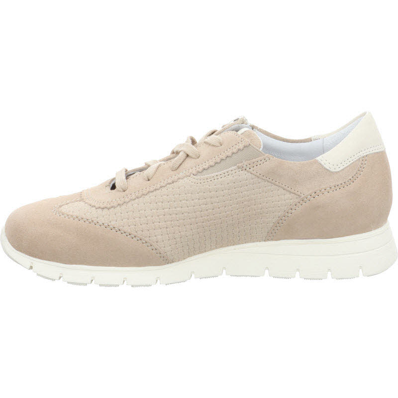 Bequemer Sneaker in hellbeigem Veloursleder. Durch die Ausführung in der beqeuemen Mehrweite H ist der Schnürschuh auch für breitere Füße geeignet. Der Seitenreißverschluss ermöglicht einen leichten Einstieg in den Schuh.